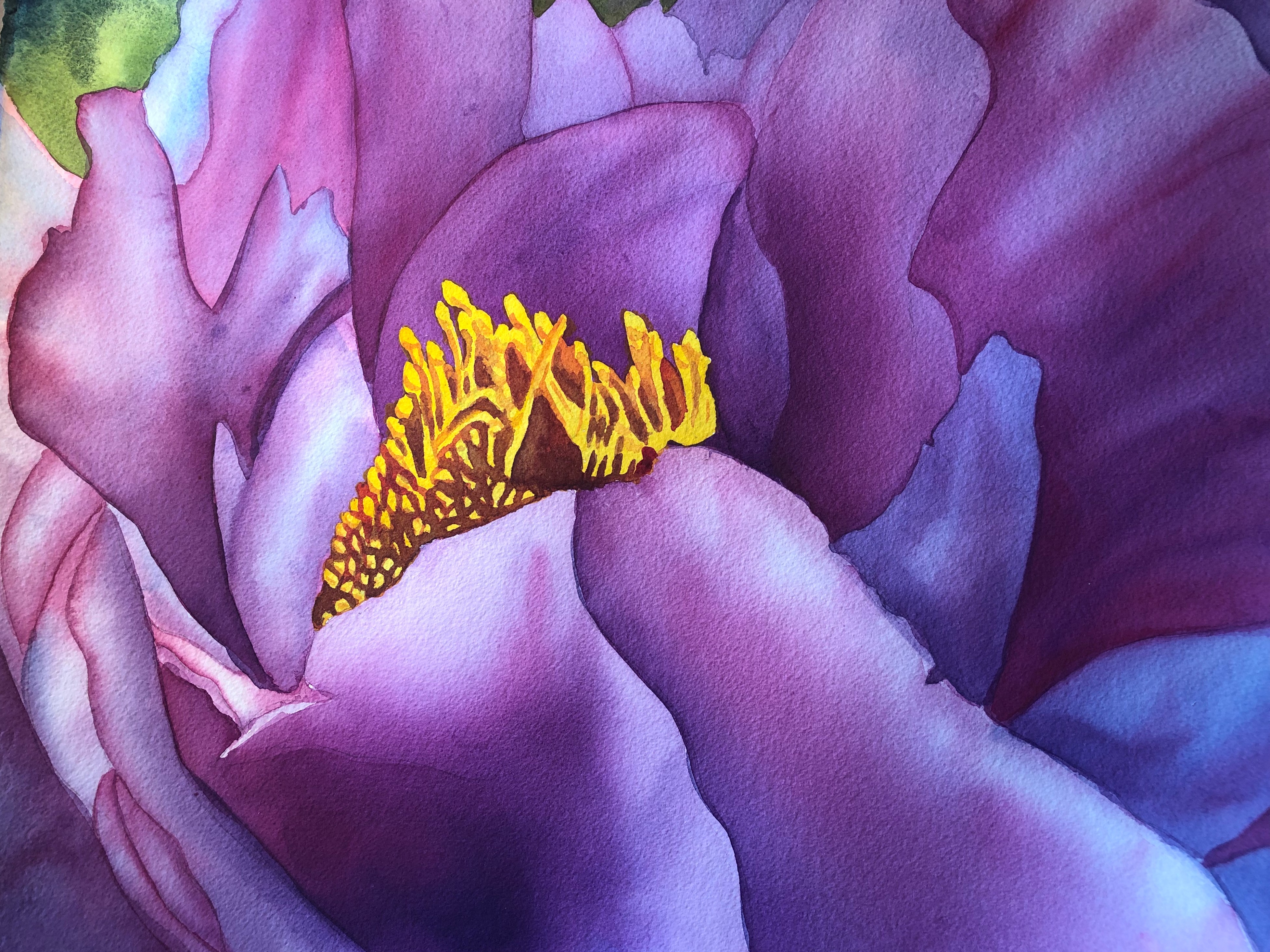 Hi I am taking an online course with Birgit O’Connor at the moment and just finished the first exercise which is to paint a Peony in bright Quinacridone Pink and Purple. My arches 3oo pound paper showed some blemishes and the Pebeo mask didn’t completely come off , but in general I learned the main objective which is to have strong values and color and pay attention to petal shapes. I feel my brushwork is improving along with water control.
