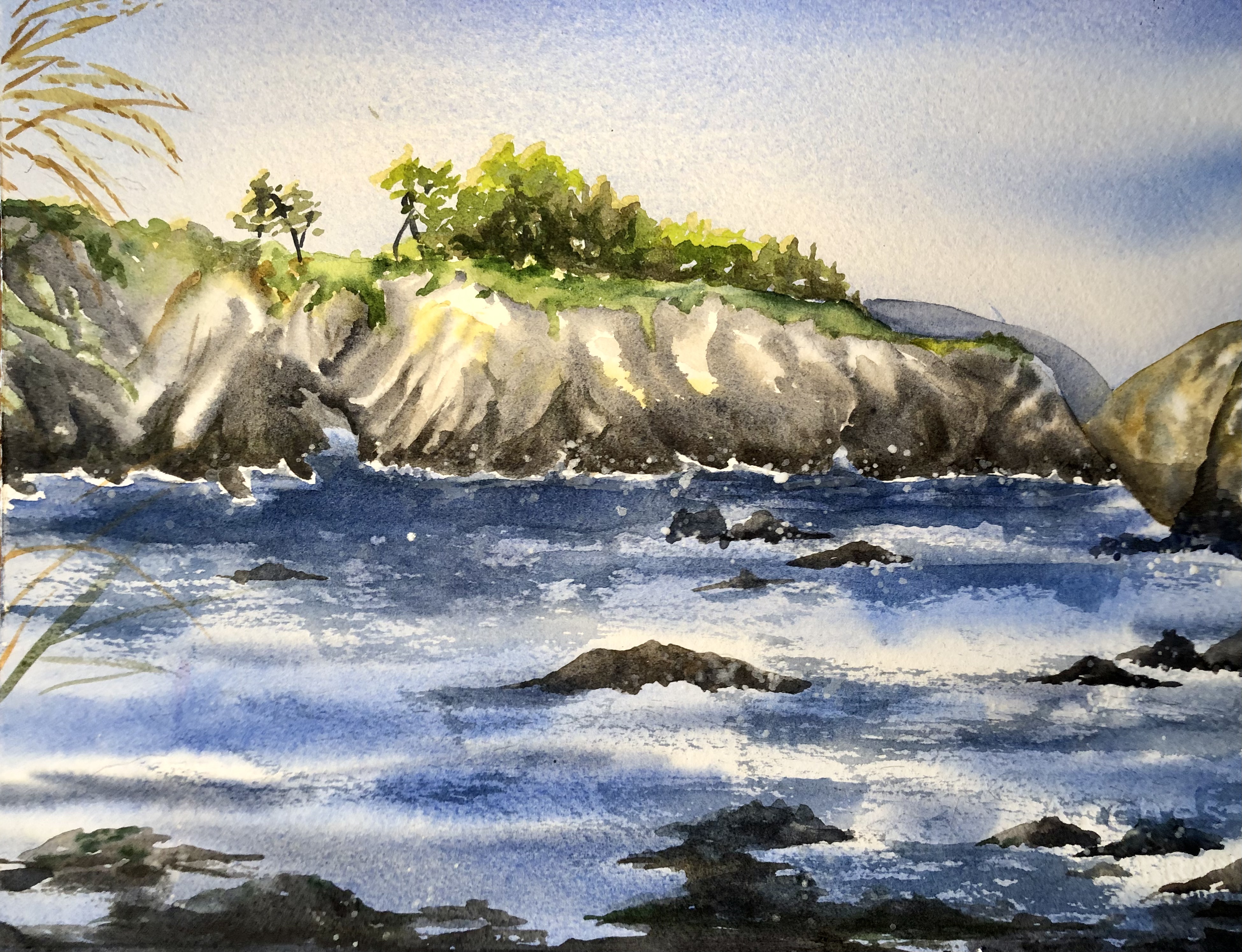 I limited my palette colors in this watercolor seascape of Mendocino’s Buckhorn Cove to Cobalt, French Ultramarine Blue, Permanent Sap Green, Green Gold, Hansa Yellow, Raw Umber, Burnt Sienna and Light Ochre.