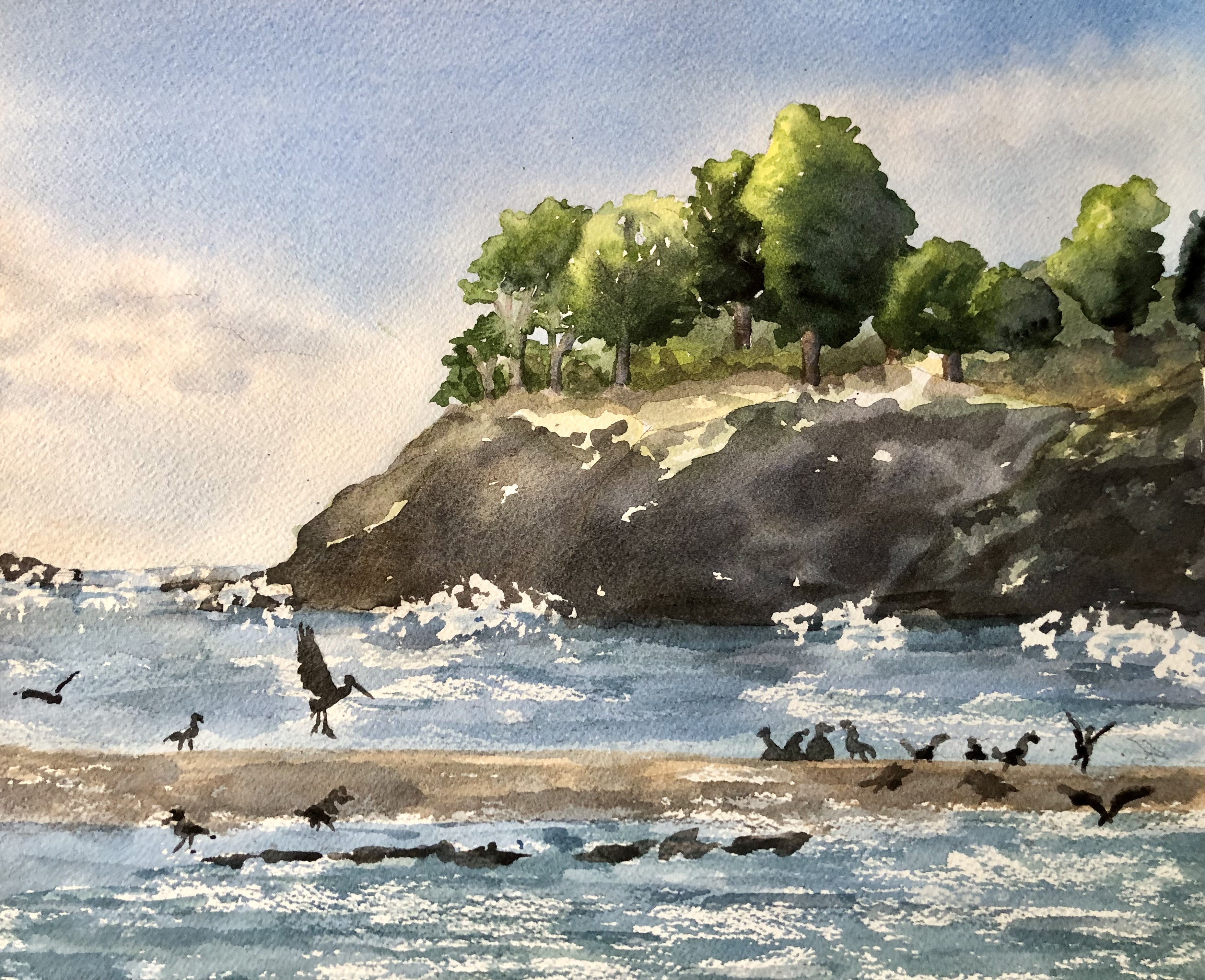 I held the brush sideways to catch the roughness of the paper and create sparkles in the ocean. Thank you to Birgit O’Connor for teaching me this brushstroke. I used a natural sponge to mask the wave at the base of the rocks and cliffs.