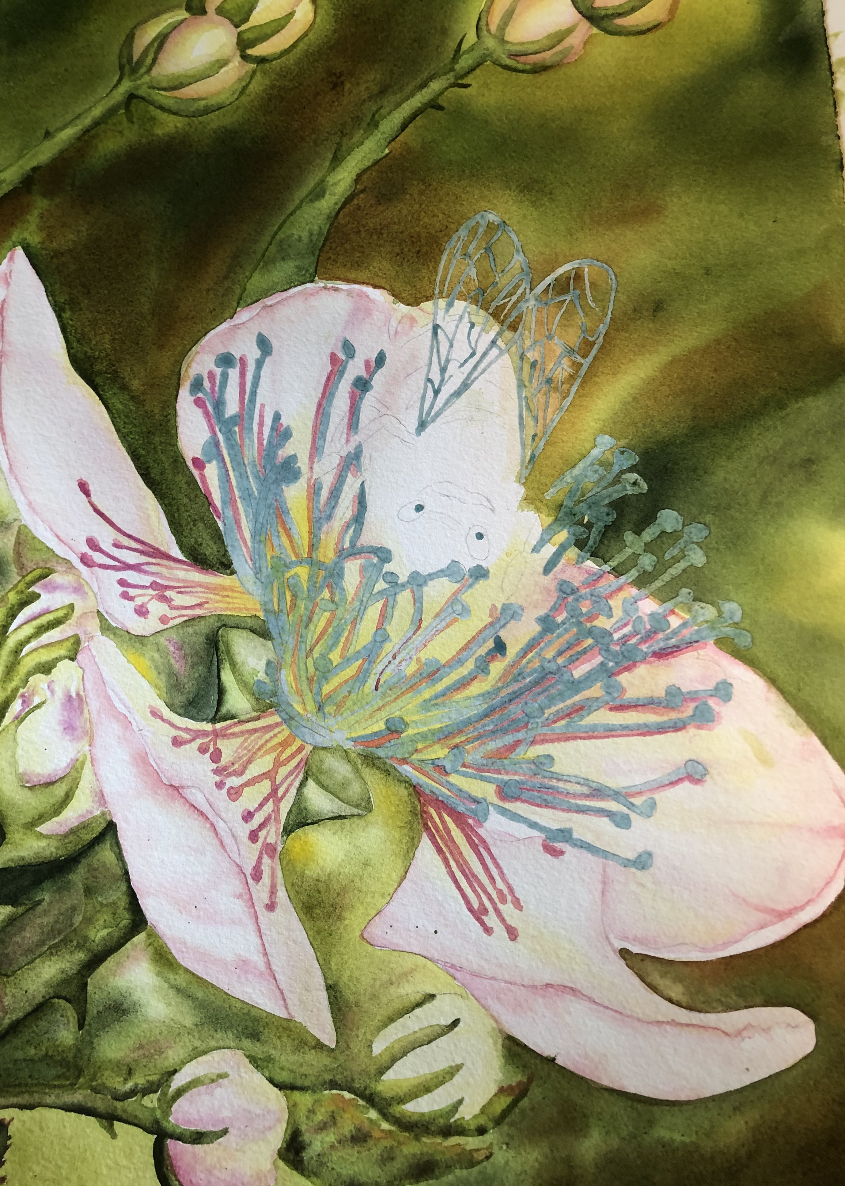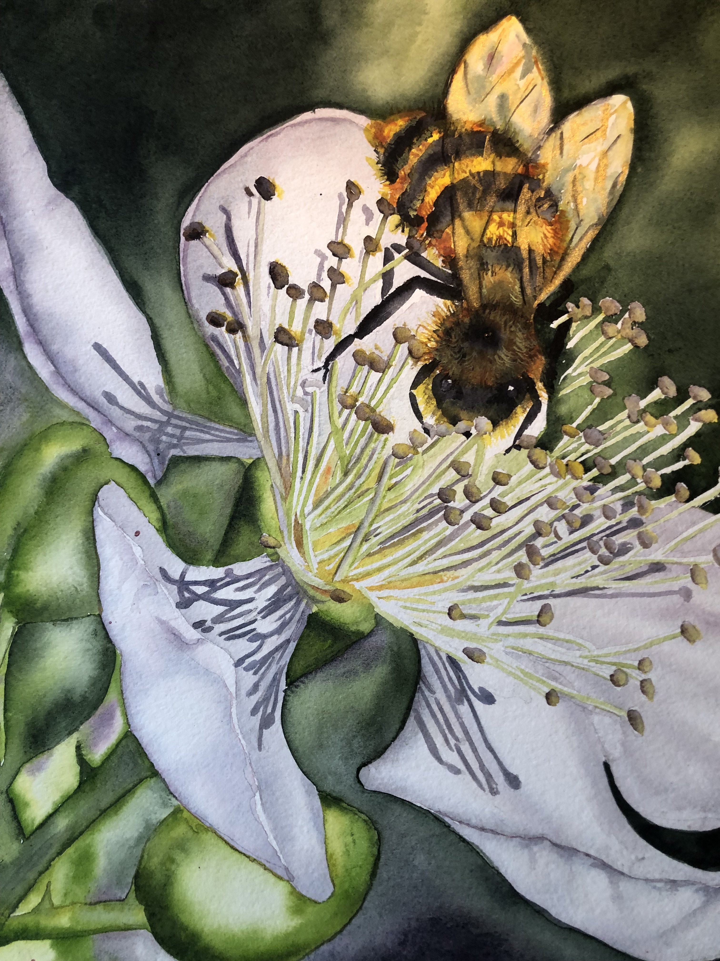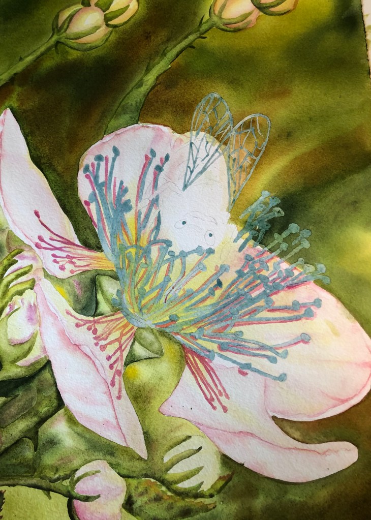This year (2024) I am painting it again and hope it will come out brighter & better! The top painting is just getting started, and I am using brighter colors. It is at what I call the ugly stage, because the blue making fluid that I will remove (to leave white paper to work on) for the center of the blossom makes it look strange. I hope to make the wings of the bee more translucent. More to come!