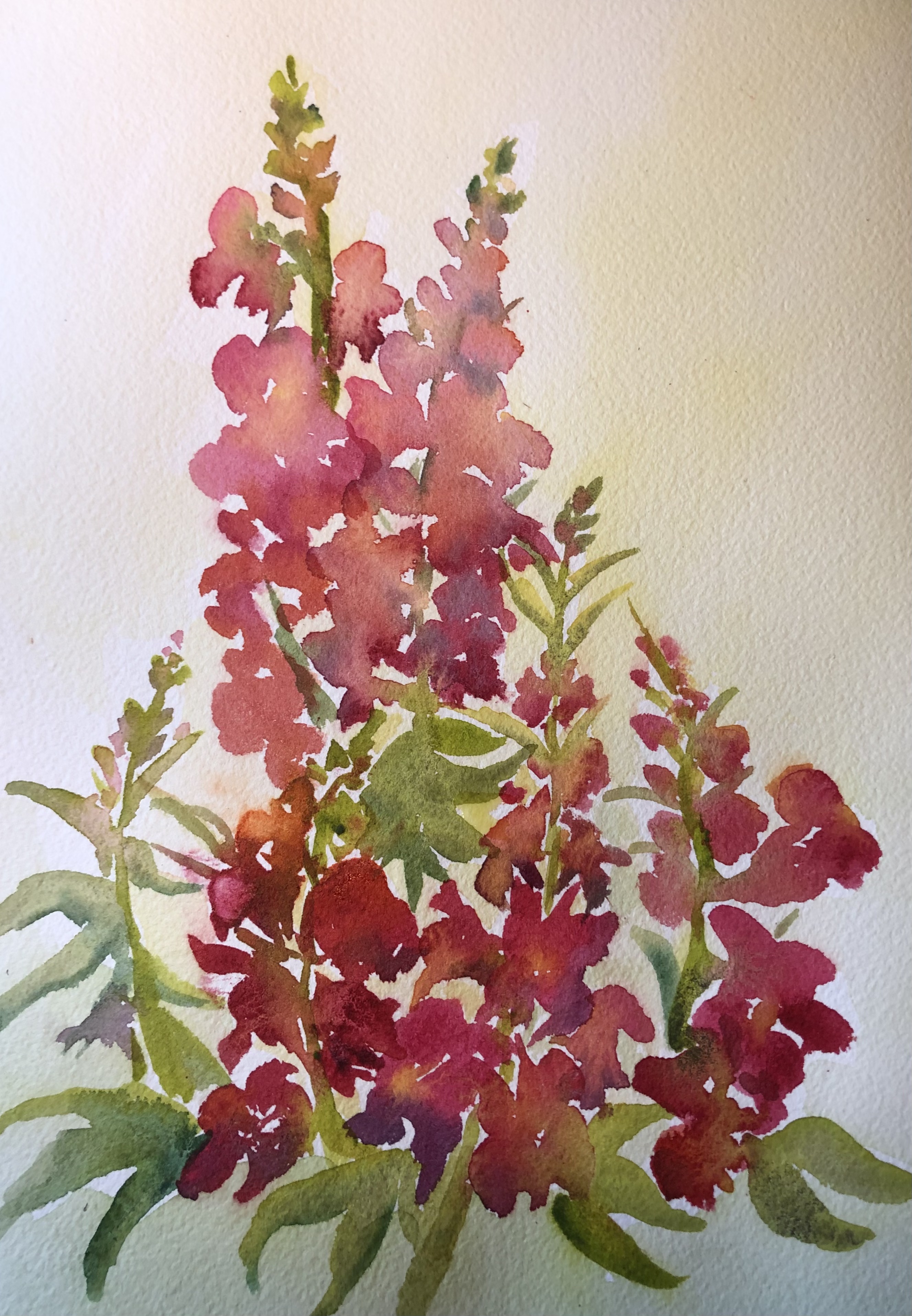 A balance of shape, value, and color in this original small study was my goal and I am reasonably pleased with the results. The snapdragons are nearly done since the heat is frying them. This study will preserve the memory of them.