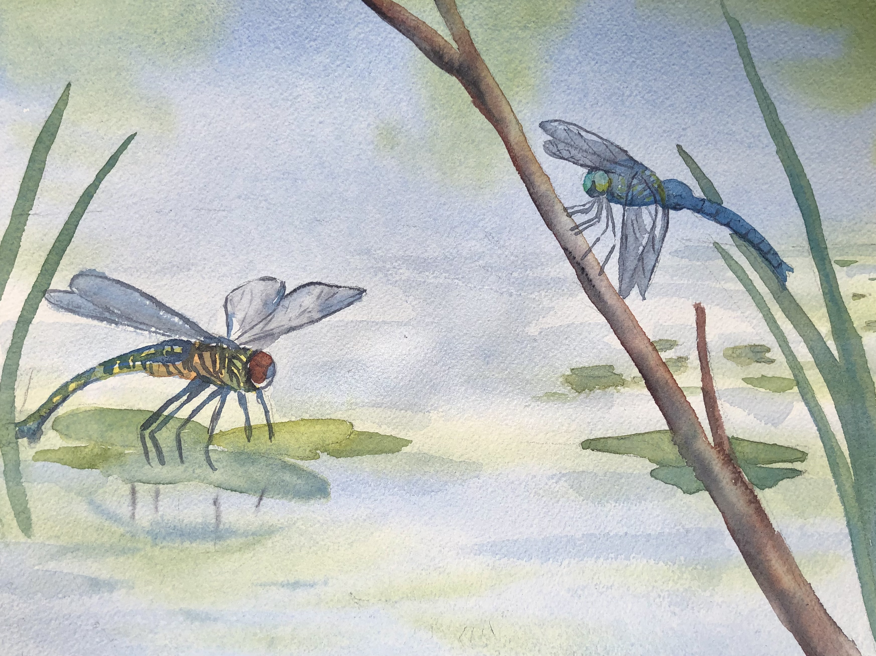 A male Blue Dasher Dragonfly watches as his mate buries their eggs in the water and mud of a pond. Dragonflies spend most of their life in water, first as eggs, and then as nymphs.