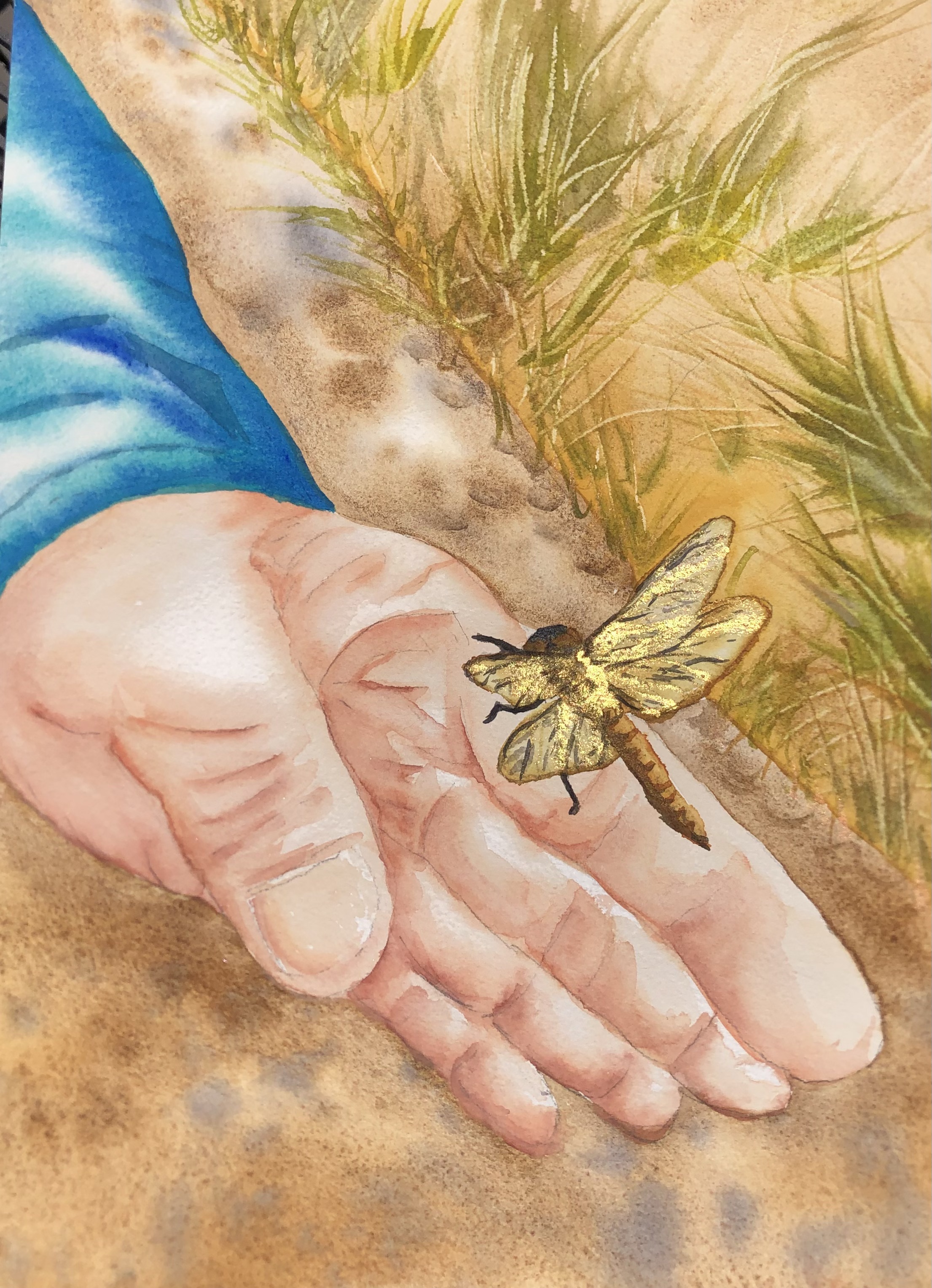 Scratching with a plastic card created the grass textures in “Richard’s scratchy friend”. The photo is courtesy of Christelle Falk. The hand is courtesy of Richard Falk who obviously is a dragonfly whisperer.