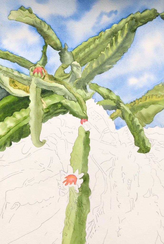 Dragon Fruit Plant, 11-1/2 x 16-1/2 inches, original watercolor work in progress.