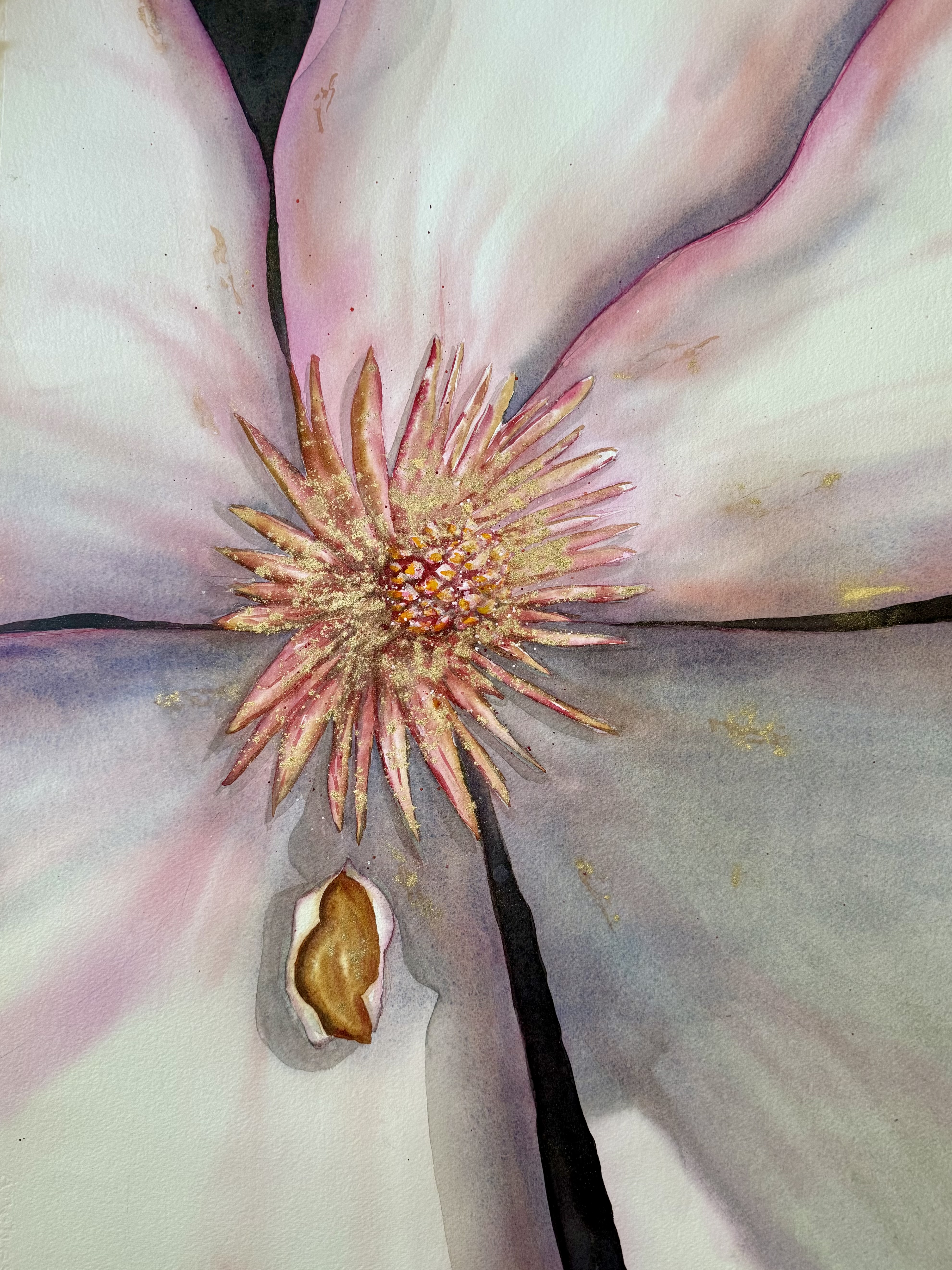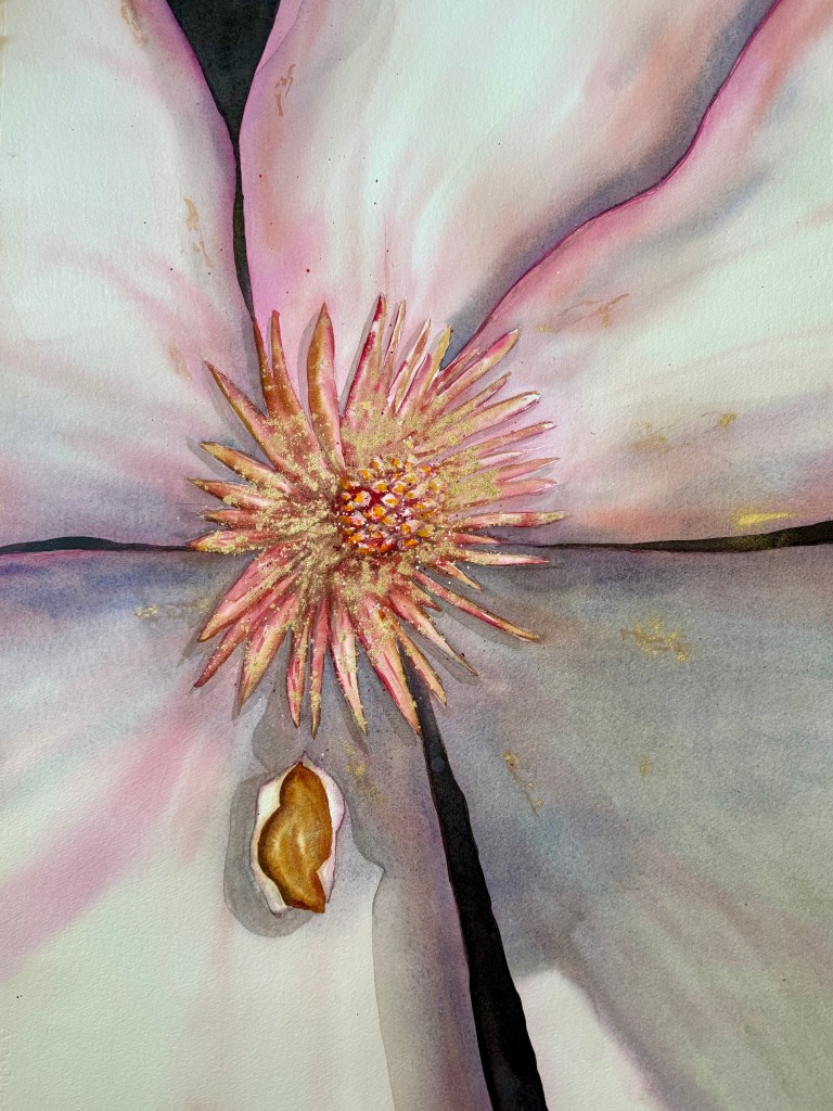 Close up of the pink tulip magnolias at the Mendocino County Courthouse that I paint every year because they are among the first trees to bloom in spring. Their resilience inspires me.